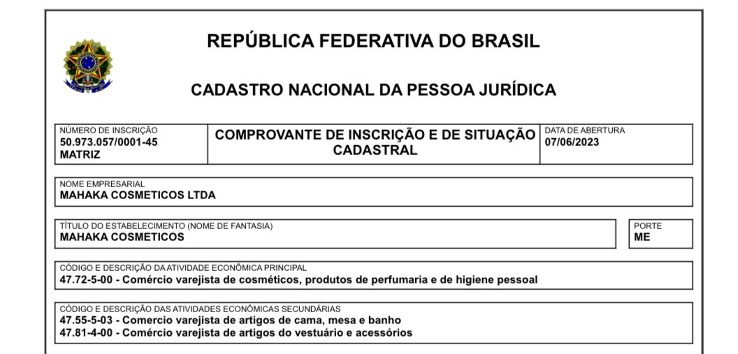 A Mahaka possui CNPJ ativo e totalmente regularizado junto a Receita Federal, comprovando nossa situação legal e transparente no mercado brasileiro. Nosso registro empresarial está em plena conformidade com todas as pbrigações discais e tributárias, garantindo que você está comprando de uma empresa séria e estabelecida