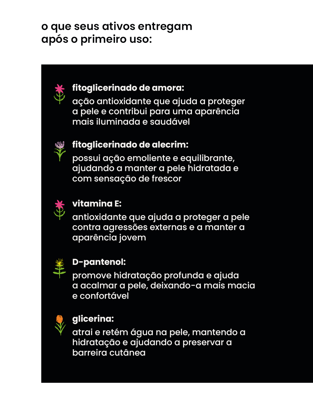 5% Fitoglicerinado de Amora (ação antioxidante que ajuda a proteger e equilibrar a pele),