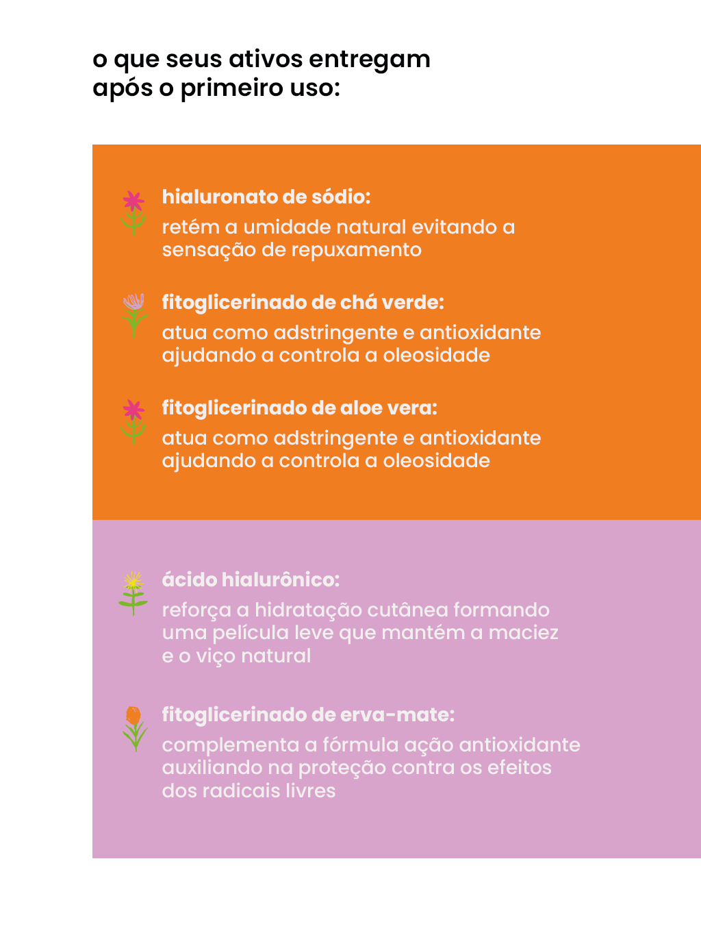 2% Fitoglicerinado de Erva Mate (ajuda a equilibrar a oleosidade e purificar a pele),